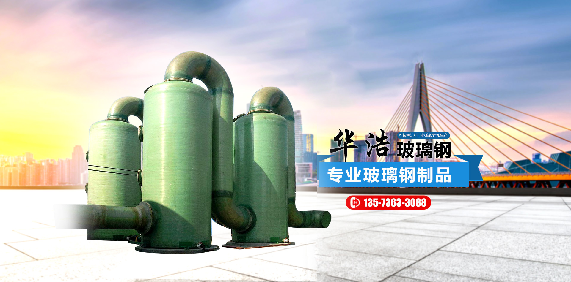 山東華浩玻璃鋼有限公司,位于世界風(fēng)箏都濰坊市南三十公里處,是生產(chǎn)各種玻璃鋼制品的專業(yè)公司。   華浩玻璃鋼生產(chǎn)各種立式、臥式玻璃鋼罐、玻璃鋼儲(chǔ)罐、玻璃鋼運(yùn)輸罐、標(biāo)準(zhǔn)運(yùn)輸罐、玻璃鋼鹽酸罐、化學(xué)反應(yīng)罐、真空壓力罐、設(shè)備罐、復(fù)合罐、玻璃鋼儲(chǔ)槽、大型玻璃鋼容器;玻璃鋼化糞池;各種型號(hào)的橫流式、逆流式(圓形、方形)玻璃鋼冷卻塔;機(jī)械纏繞玻璃鋼管道、管件、壓力管道,有機(jī)、無機(jī)通風(fēng)管道、空調(diào)管道;漂液洗鼓、耐腐耐高溫反應(yīng)釜、印染布車、組合式玻璃鋼水箱、玻璃鋼風(fēng)機(jī)、玻璃鋼不定型工藝品等二百多個(gè)品種。